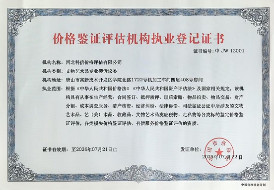 河北科信價格評估有限公司為"AAA"級信用企業,具有商務部、文化部備案,頒發相關鑒定與專業評估資質,由河北省價格評估行業協會頒發的“甲級”《價格評估機構執業登記證書》。公司是河北省價格評估行業協會常務理事單位,河北省科技型中小企業,河北省政府中介超市入冊鑒定評估機構、唐山市政府中介超市入冊的鑒定評估機構、唐山仲裁委員會入冊鑒定評估機構。依法在唐山工商行政管理部門注冊登記的獨立第三方評估機構。公司成立于2015年,注冊資金300萬元人民幣,公司擁有多名價格鑒證師、價格評估專業人員、國家高級、中級機動車鑒定評估師、中級涉案財物評估師、汽車估損師、保險公估師、高級林業工程師等,為您提供專業優質的服務,公司嚴格按照程序組織實施鑒定評估以及合法的市場調查業務,所出具的價格評估報告書、意見書具有法律效力并為國家認可。公司自成立以來共接受河北省交警系統、法院系統、檢察院系統、交通局系統、財政系統、銀行系統以及社會各界人士的各類委托3000余件,受到一致好評。在執業過程中,我們將依照相關的法律、法規,嚴格遵循客觀、獨立、公正、公平、科學性的原則;竭誠為您提供專業、權威的價格評估服務和信息咨詢服務;為您提供專業、快捷的優質服務。
